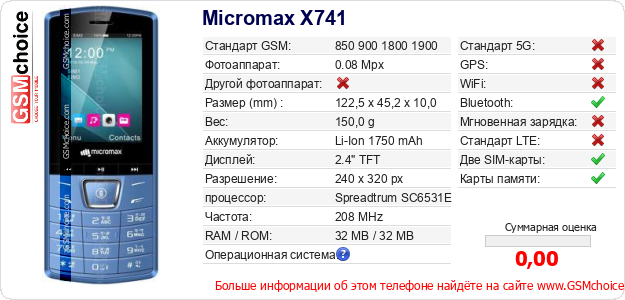 У Тебя есть свой сайт? Хочешь где-то разместить информацию о базовых данных мобильника Micromax X741 ? Это запросто устроить. Достаточно скачать картинку или скопировать и разместить на соответствующем сайте нижерасположенный код:Размещение этого кода вызовет появление нижерасположенной картинки: