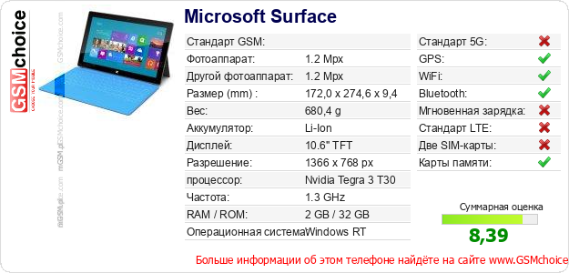У Тебя есть свой сайт? Хочешь где-то разместить информацию о базовых данных мобильника Microsoft Surface ? Это запросто устроить. Достаточно скачать картинку или скопировать и разместить на соответствующем сайте нижерасположенный код:Размещение этого кода вызовет появление нижерасположенной картинки: