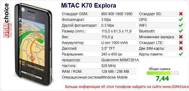 Данные о телефоне MiTAC K70 Explora на Вашем сайте