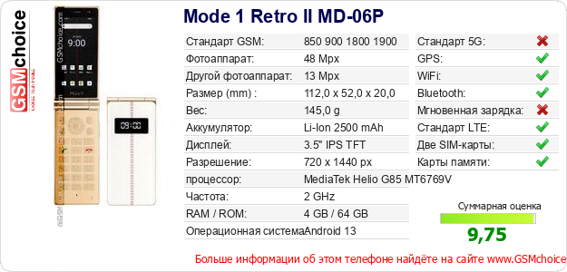 Данные о телефоне Mode 1 Retro II MD-06P на Вашем сайте