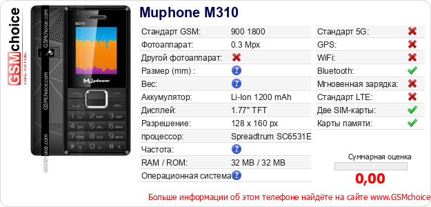 У Тебя есть свой сайт? Хочешь где-то разместить информацию о базовых данных мобильника Muphone M310 ? Это запросто устроить. Достаточно скачать картинку или скопировать и разместить на соответствующем сайте нижерасположенный код:Размещение этого кода вызовет появление нижерасположенной картинки: