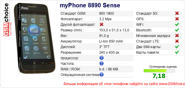 У Тебя есть свой сайт? Хочешь где-то разместить информацию о базовых данных мобильника myPhone 8890 Sense ? Это запросто устроить. Достаточно скачать картинку или скопировать и разместить на соответствующем сайте нижерасположенный код:Размещение этого кода вызовет появление нижерасположенной картинки: