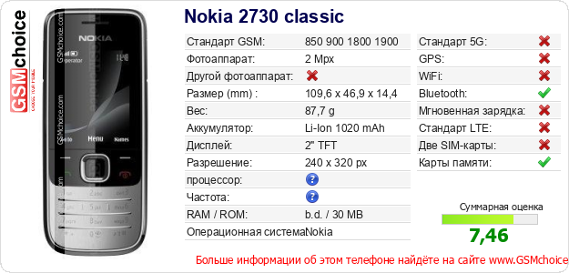 У Тебя есть свой сайт? Хочешь где-то разместить информацию о базовых данных мобильника Nokia 2730 classic ? Это запросто устроить. Достаточно скачать картинку или скопировать и разместить на соответствующем сайте нижерасположенный код:Размещение этого кода вызовет появление нижерасположенной картинки: