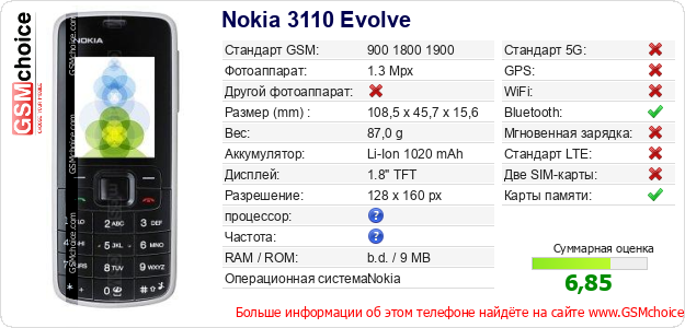 Данные о телефоне Nokia 3110 Evolve на Вашем сайте