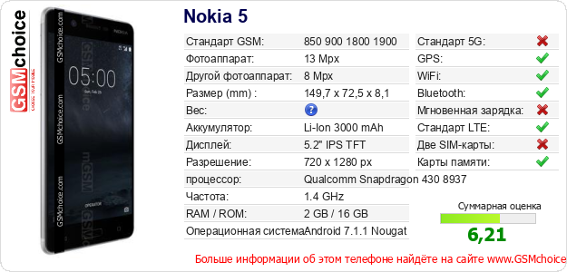 Данные о телефоне Nokia 5 на Вашем сайте