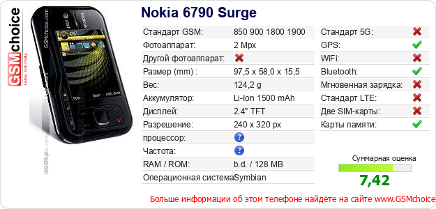 У Тебя есть свой сайт? Хочешь где-то разместить информацию о базовых данных мобильника Nokia 6790 Surge ? Это запросто устроить. Достаточно скачать картинку или скопировать и разместить на соответствующем сайте нижерасположенный код:Размещение этого кода вызовет появление нижерасположенной картинки: