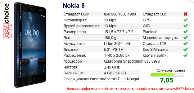 Данные о телефоне Nokia 8 на Вашем сайте