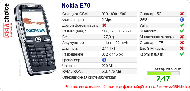 Данные о телефоне Nokia E70 на Вашем сайте