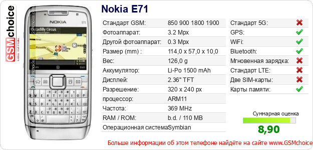 У Тебя есть свой сайт? Хочешь где-то разместить информацию о базовых данных мобильника Nokia E71 ? Это запросто устроить. Достаточно скачать картинку или скопировать и разместить на соответствующем сайте нижерасположенный код:Размещение этого кода вызовет появление нижерасположенной картинки: