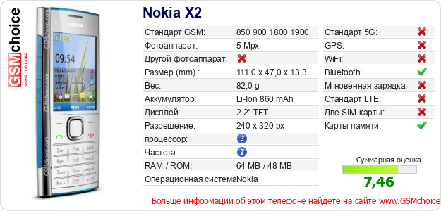 У Тебя есть свой сайт? Хочешь где-то разместить информацию о базовых данных мобильника Nokia X2 ? Это запросто устроить. Достаточно скачать картинку или скопировать и разместить на соответствующем сайте нижерасположенный код:Размещение этого кода вызовет появление нижерасположенной картинки: