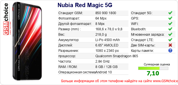 Данные о телефоне Nubia Red Magic 5G на Вашем сайте