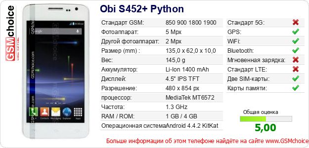 Данные о телефоне Obi S452+ Python на Вашем сайте