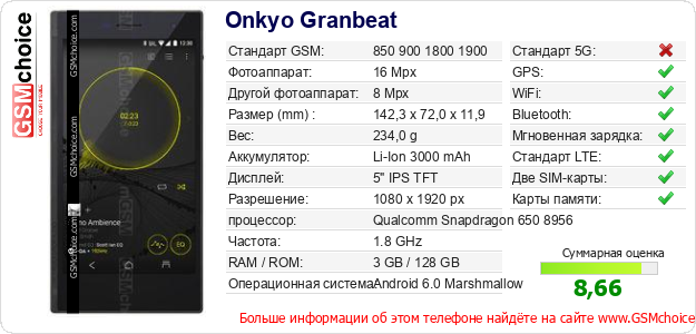 Данные о телефоне Onkyo Granbeat на Вашем сайте