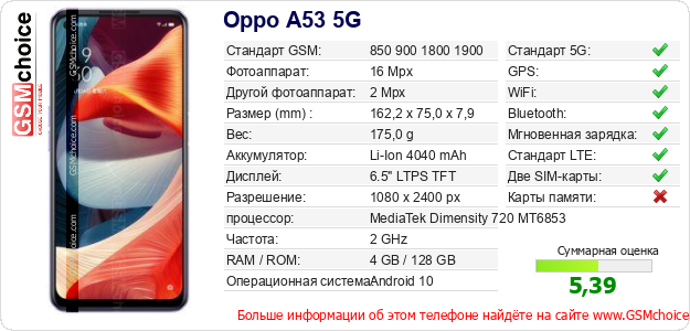 Данные о телефоне Oppo A53 5G на Вашем сайте