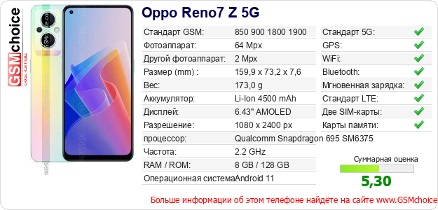 Данные о телефоне Oppo Reno7 Z 5G на Вашем сайте