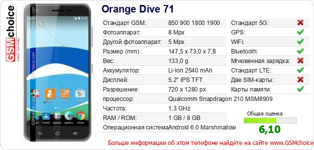 Данные о телефоне Orange Dive 71 на Вашем сайте