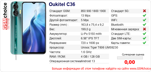 Данные о телефоне Oukitel C36 на Вашем сайте
