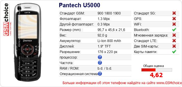 Данные о телефоне Pantech U5000 на Вашем сайте