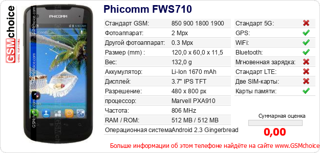 Данные о телефоне Phicomm FWS710 на Вашем сайте