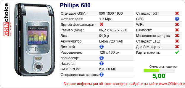 Данные о телефоне Philips 680 на Вашем сайте