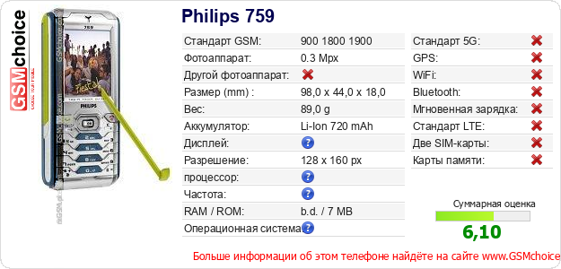 У Тебя есть свой сайт? Хочешь где-то разместить информацию о базовых данных мобильника Philips 759 ? Это запросто устроить. Достаточно скачать картинку или скопировать и разместить на соответствующем сайте нижерасположенный код:Размещение этого кода вызовет появление нижерасположенной картинки: