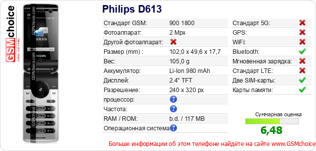 Данные о телефоне Philips D613 на Вашем сайте