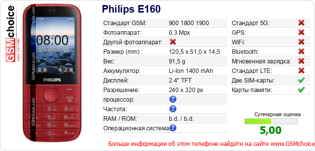 Данные о телефоне Philips E160 на Вашем сайте