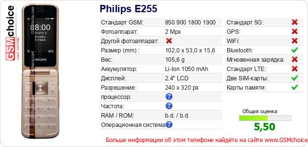Данные о телефоне Philips E255 на Вашем сайте