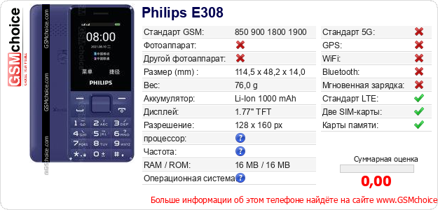 У Тебя есть свой сайт? Хочешь где-то разместить информацию о базовых данных мобильника Philips E308 ? Это запросто устроить. Достаточно скачать картинку или скопировать и разместить на соответствующем сайте нижерасположенный код:Размещение этого кода вызовет появление нижерасположенной картинки: