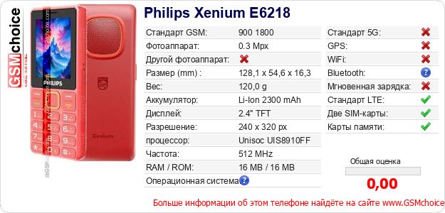 Данные о телефоне Philips Xenium E6218 на Вашем сайте
