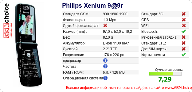 У Тебя есть свой сайт? Хочешь где-то разместить информацию о базовых данных мобильника Philips Xenium 9@9r ? Это запросто устроить. Достаточно скачать картинку или скопировать и разместить на соответствующем сайте нижерасположенный код:Размещение этого кода вызовет появление нижерасположенной картинки: