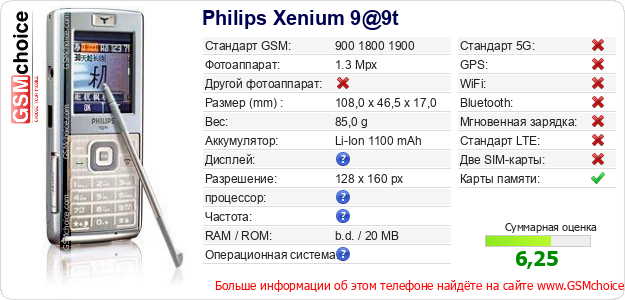 У Тебя есть свой сайт? Хочешь где-то разместить информацию о базовых данных мобильника Philips Xenium 9@9t ? Это запросто устроить. Достаточно скачать картинку или скопировать и разместить на соответствующем сайте нижерасположенный код:Размещение этого кода вызовет появление нижерасположенной картинки: