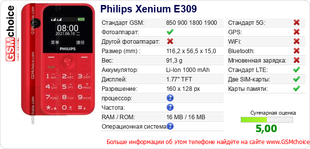 Данные о телефоне Philips Xenium E309 на Вашем сайте