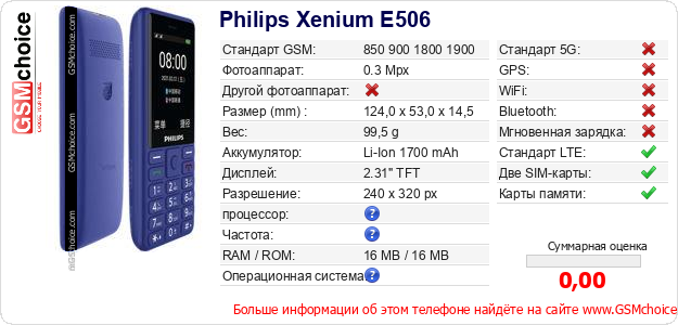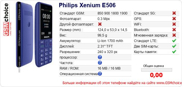 Данные о телефоне Philips Xenium E506 на Вашем сайте