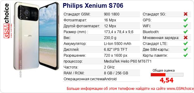 Данные о телефоне Philips Xenium S706 на Вашем сайте