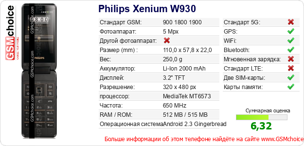 Данные о телефоне Philips Xenium W930 на Вашем сайте