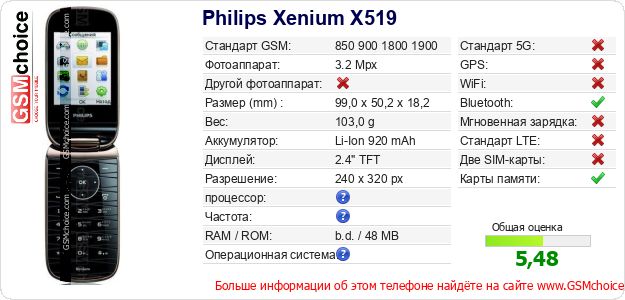 Данные о телефоне Philips Xenium X519 на Вашем сайте