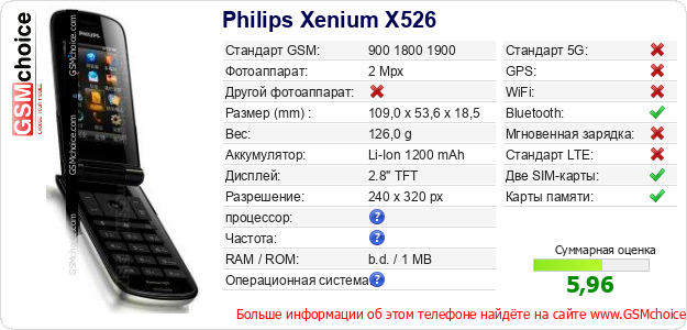 Данные о телефоне Philips Xenium X526 на Вашем сайте