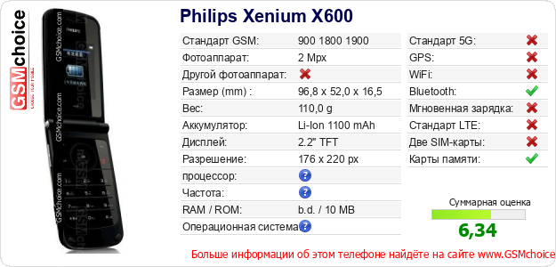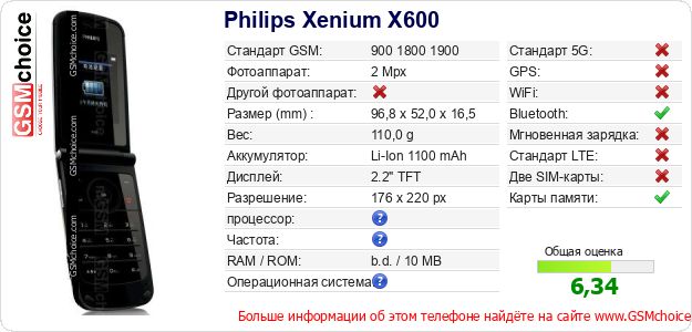 У Тебя есть свой сайт? Хочешь где-то разместить информацию о базовых данных мобильника Philips Xenium X600 ? Это запросто устроить. Достаточно скачать картинку или скопировать и разместить на соответствующем сайте нижерасположенный код:Размещение этого кода вызовет появление нижерасположенной картинки: