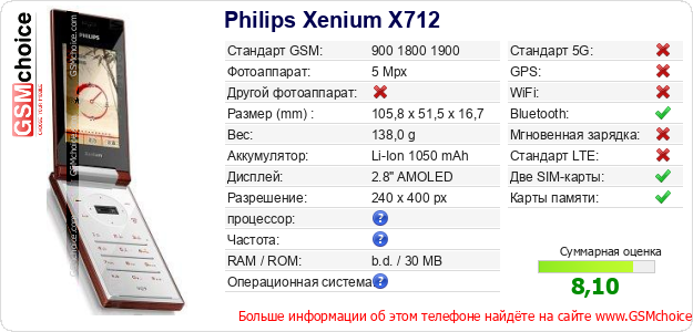 Данные о телефоне Philips Xenium X712 на Вашем сайте