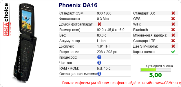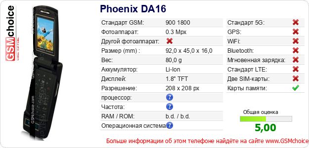 Данные о телефоне Phoenix DA16 на Вашем сайте