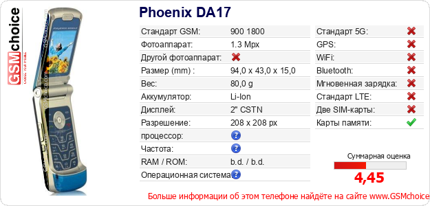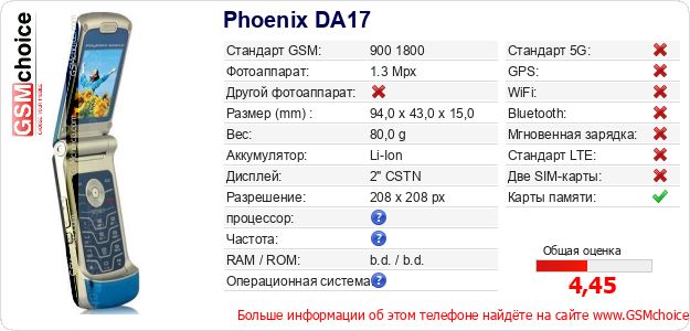 Данные о телефоне Phoenix DA17 на Вашем сайте