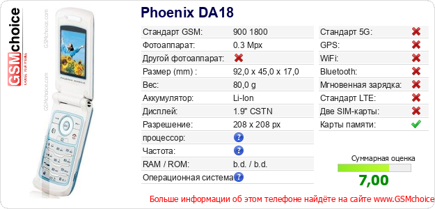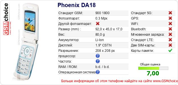 Данные о телефоне Phoenix DA18 на Вашем сайте