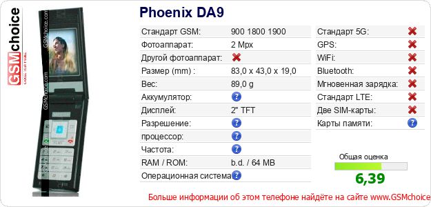 Данные о телефоне Phoenix DA9 на Вашем сайте
