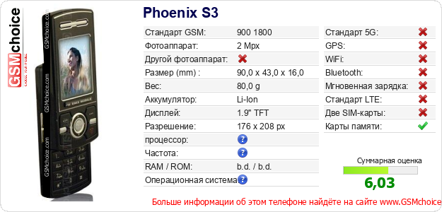 Данные о телефоне Phoenix S3 на Вашем сайте