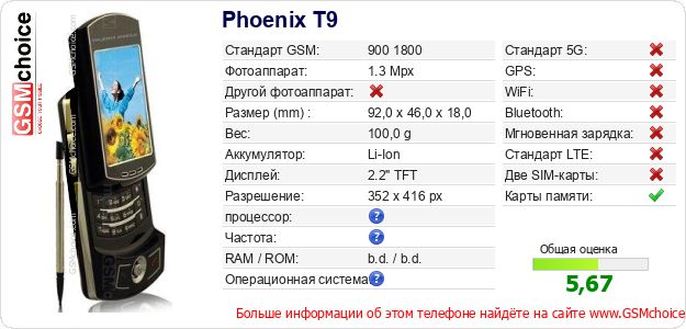 Данные о телефоне Phoenix T9 на Вашем сайте