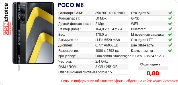 У Тебя есть свой сайт? Хочешь где-то разместить информацию о базовых данных мобильника POCO M8 ? Это запросто устроить. Достаточно скачать картинку или скопировать и разместить на соответствующем сайте нижерасположенный код:Размещение этого кода вызовет появление нижерасположенной картинки: