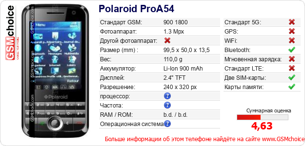 Данные о телефоне Polaroid ProA54 на Вашем сайте