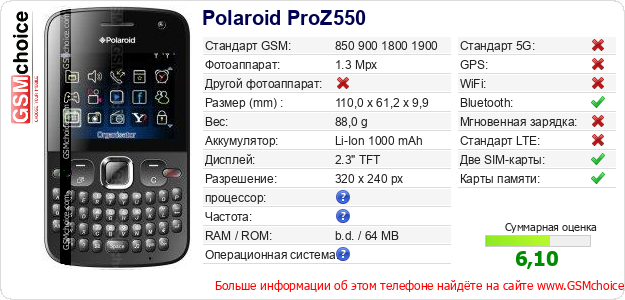 Данные о телефоне Polaroid ProZ550 на Вашем сайте