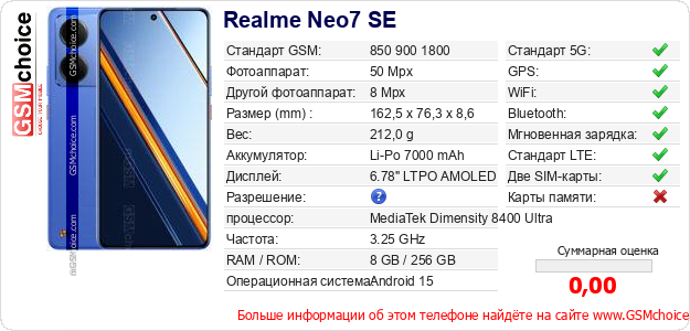 У Тебя есть свой сайт? Хочешь где-то разместить информацию о базовых данных мобильника Realme Neo7 SE ? Это запросто устроить. Достаточно скачать картинку или скопировать и разместить на соответствующем сайте нижерасположенный код:Размещение этого кода вызовет появление нижерасположенной картинки: